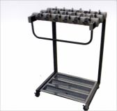 烤漆骨架,塑膠一體成型底盤三排每排放六支雨傘;每孔附二支鑰匙,一個三槽集水底盤