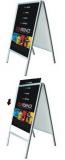 圓角A型鋁製雙面海報框,整體尺寸為51.5*100cm,支持畫面尺寸為48cm*75cm,畫面從頂部安裝,換畫方便。每張畫面都有亞克力支撐並保護。是商店、餐廳等公共場所的良好宣傳用品。