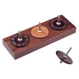 新奇有趣,此旋轉陀螺日曆座是採用胡桃實木製作,三個陀螺分別使用胡桃木色,山毛櫸色,以及桃花心木色,並含有月、日及星期。