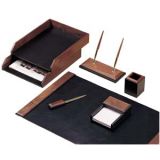 利用原木色的質感輔以黑色褡配,整組構思完善,又加工上製工精緻,使具實用之辦公文具提昇至可珍藏的境界. 本件是現代工業設計中不可多得的好產品,使用者的氣質和權威感皆可由產品表達,這是值得提倡的工藝量產化之典範。 1050D 桌墊 65 x 42.3 x 1.3 公分 1152D 雙筆座 ( 附實木抬筆2支) 23 x 9.6 x 2.2 公分 1250D 4" x 6" 便條盒(附便條紙120張) 16.7 x 12 x 4.4 公分 1430D 雙層公文盒 34.5 x 27 x 6.5 公分(單層尺寸) 1550D 筆筒 7.1 x 7.1 x 9.3 公分 1650D 拆信刀 20.4 x 30 x 1.9 公分