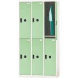 全鋼製(0.8mm) 門板。 門板數為:6 門。 內部空間:寬27cm 深48cm 高84.5cm。 內附配件:鏡片x1片、吊衣桿x1支、活動隔板x1片。 門板顏色 : A(905色)、B(淺綠色)、C(淺藍色)可選。 採用萬能鎖型手把(使用者及管理者各有鑰匙)。 門板採用本公司專利設計後鈕及插梢固定,不易損壞。 每台櫃體偕有預設相互連結孔,以利左右連結,增加其穩固及整齊美觀。 每格空間皆可隨時增購格板,並可調其高低,使空間更加活用。 門板上有圓型透明孔、小圓柱型通風孔及一體成型標式框(附標籤紙x1張)。 商品規格:W900xD510xH1802 mm